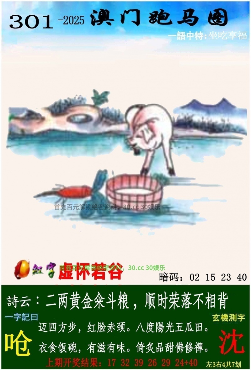 | 诗云:二两黄金籴斗粮,顺时荣落不相背 迈四方步,红脸赤颈,八度阳光五瓜田 衣食饭碗,有滋有味,倚炙品甜佛修禅 《沈》 |
